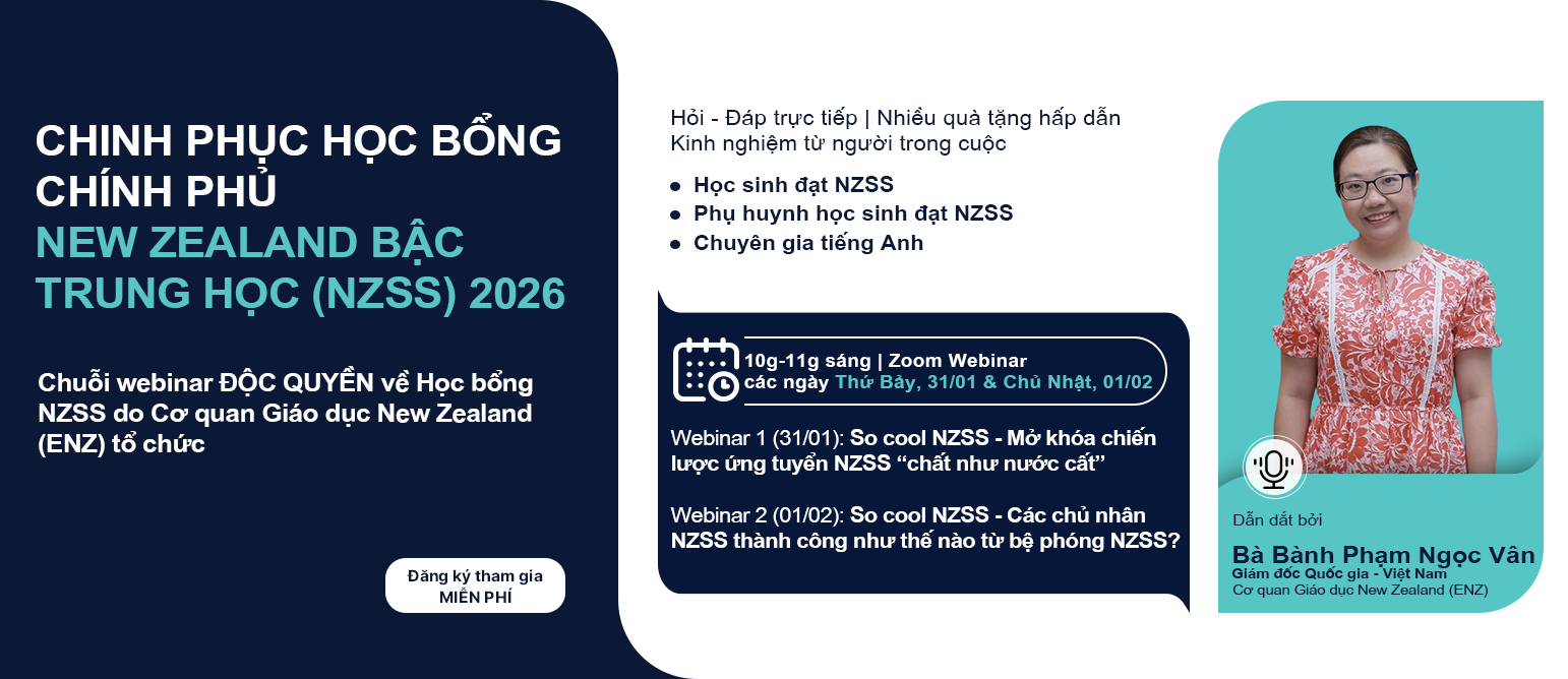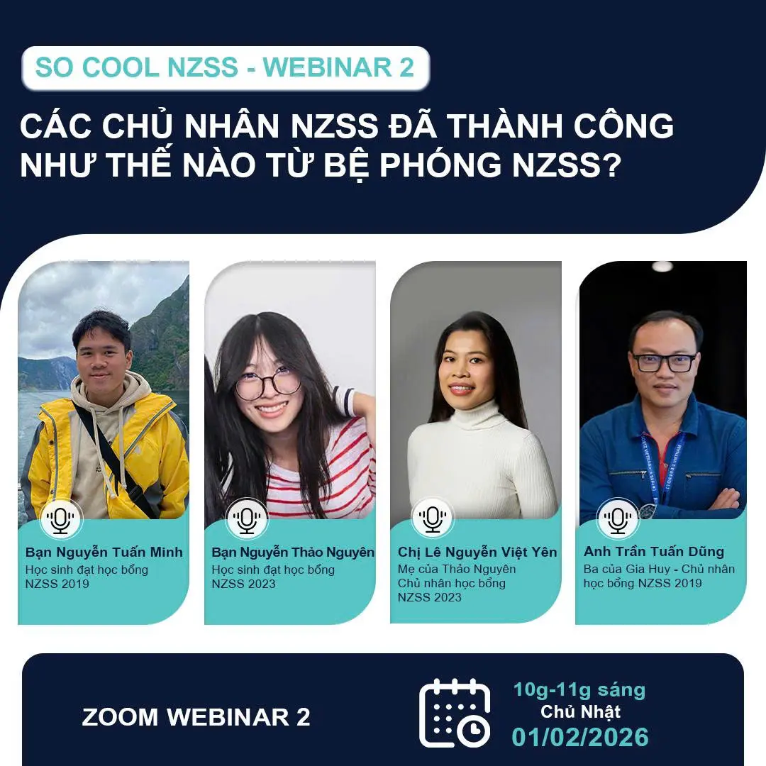 Nhằm cung cấp thông tin chính thống về điều kiện ứng tuyển, yêu cầu tiếng Anh, đồng thời tạo cơ hội trao đổi trực tiếp giữa người xem và các phụ huynh, học sinh NZSS qua các năm, Cơ quan Giáo dục New Zealand (ENZ) tổ chức chuỗi webinar “Chinh phục NZSS 2026” giúp ứng viên năm nay chuẩn bị sẵn sàng và tốt nhất để chinh phục học bổng năm nay. Chương trình diễn ra vào hai ngày thứ Bảy, 31/01 và Chủ Nhật, 01/02 theo hình thức trực tuyến. Chuỗi chương trình quy tụ Giám đốc Quốc gia Việt Nam của Cơ quan Giáo dục New Zealand cùng các chủ nhân học bổng NZSS qua nhiều năm, phụ huynh học sinh và các chuyên gia đào tạo tiếng Anh.