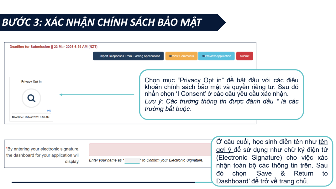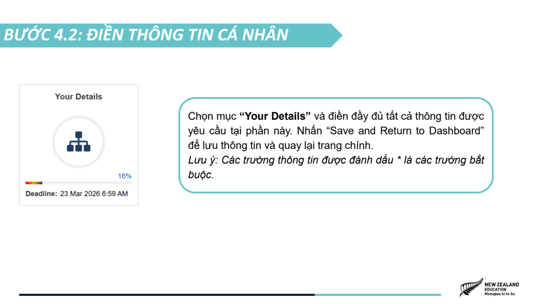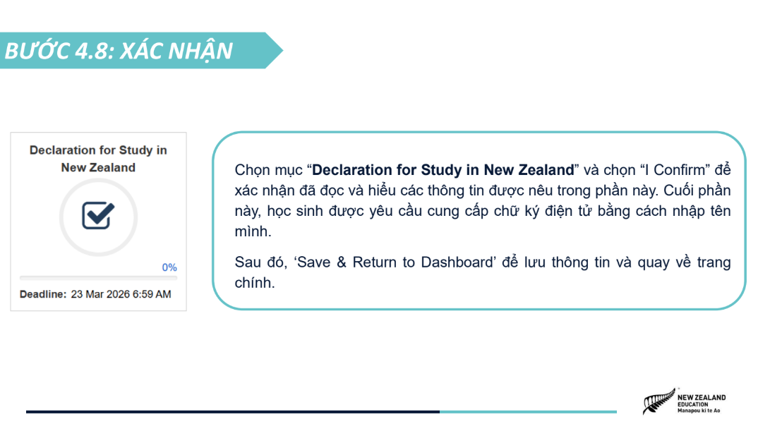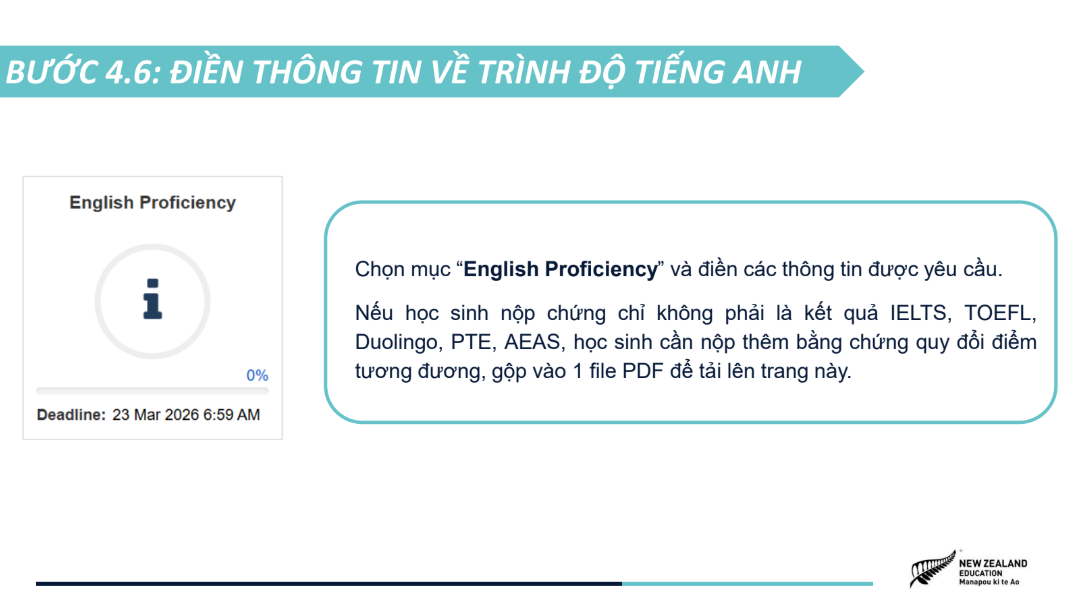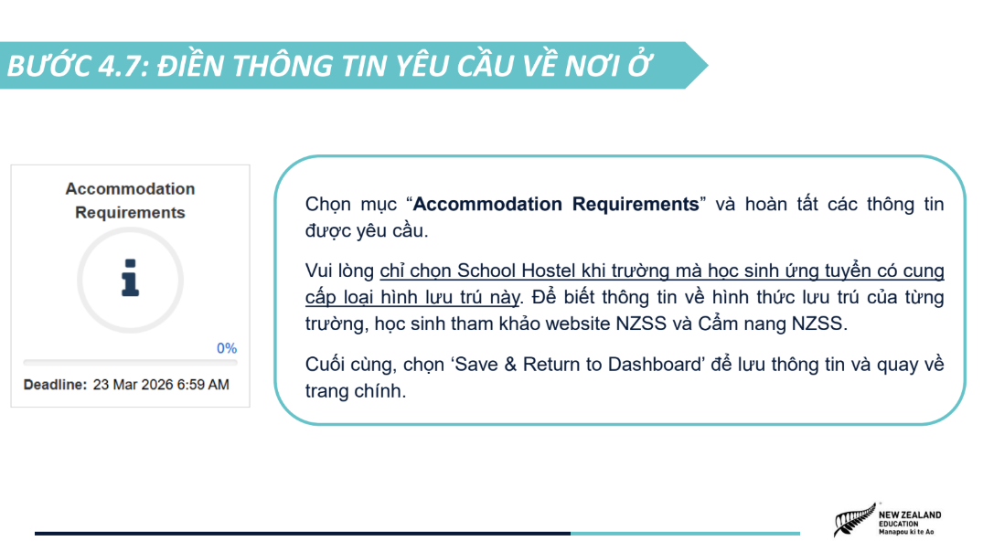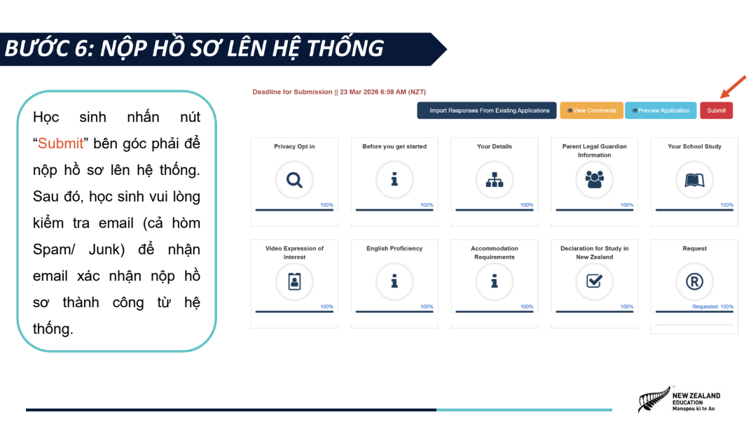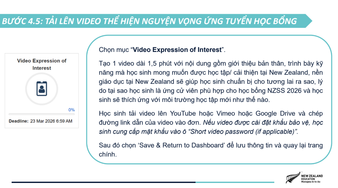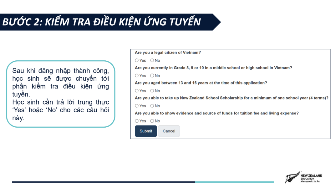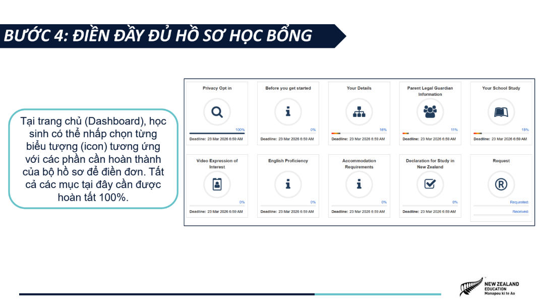 Hồ sơ ứng tuyển được tinh gọn, bao gồm bảng điểm, chứng chỉ tiếng Anh quốc tế (nếu có) và video 1,5 phút giới thiệu câu chuyện bản thân, khuyến khích học sinh thể hiện cá tính và tư duy sáng tạo. NZSS 2026 áp dụng cơ chế xét tuyển kép với hai nguyện vọng trường, giúp học sinh tối ưu cơ hội nhận học bổng, đồng thời tiếp cận các học bổng riêng của các trường trung học New Zealand chỉ với một lần nộp hồ sơ. Chương trình mở đơn ứng tuyển từ ngày 05/01/2026 đến hết ngày 22/03/2026, dành cho học sinh Việt Nam đang học lớp 8, 9, 10 tại Việt Nam, có điểm trung bình học tập từ 8.0 trở lên và trình độ tiếng Anh tương đương IELTS 5.0+. Tham khảo chi tiết về chương trình Học bổng NZSS 2026 và các hướng dẫn nộp đơn ứng tuyển tại TRANG WEB CHÍNH THỨC. |
