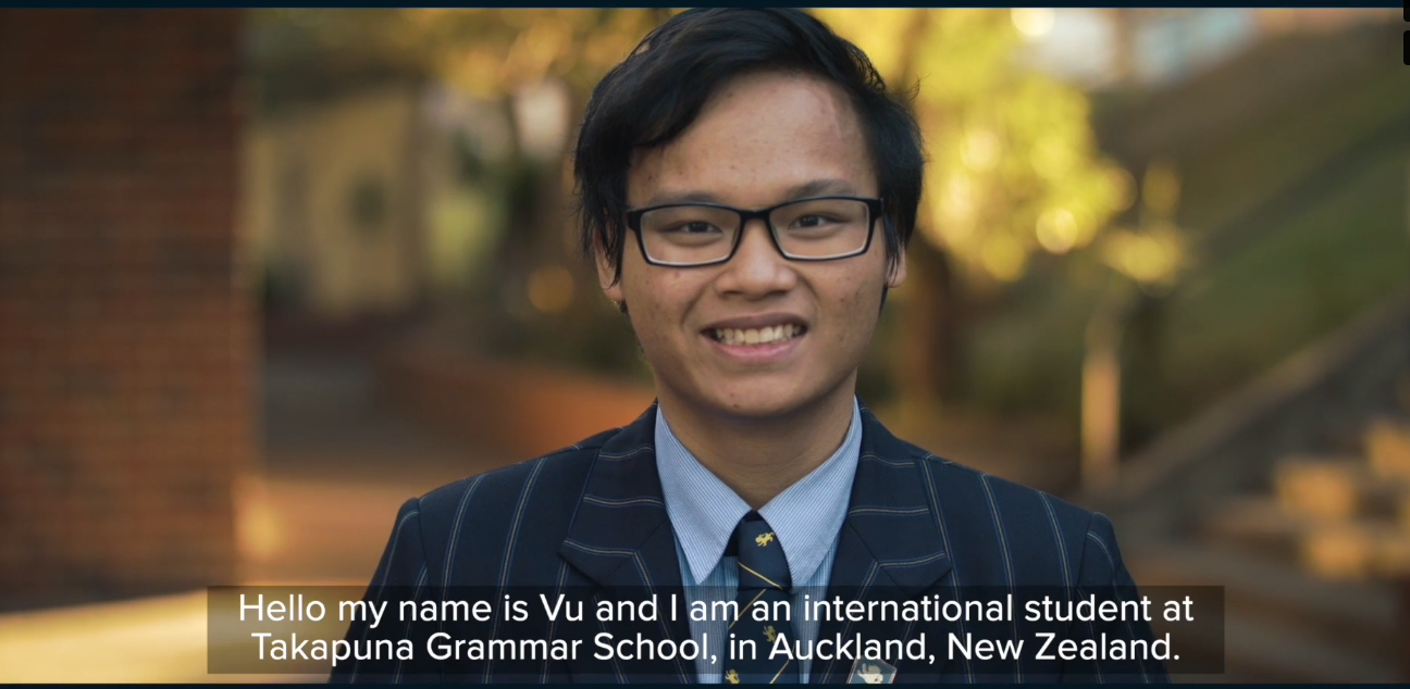 Em là thành viên của đội Lãnh đạo Quốc tế của trường. Với học sinh quốc tế, trường có hai lựa chọn chương trình học: NCEA và Tú tài Quốc tế (IB). Em cũng tham gia các hoạt động sau giờ học và chơi thể thao để hoàn thiện bản thân hơn. Ở Takapuna Grammar School, em luôn nhận được rất nhiều sự hỗ trợ từ thầy cô.